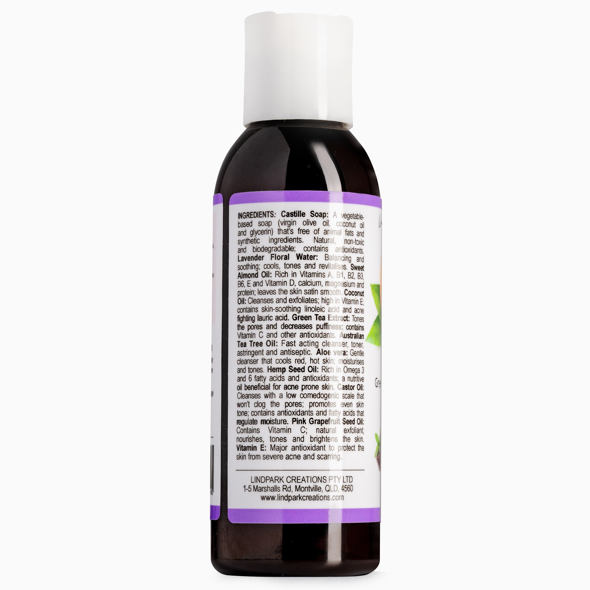 | Ingredients: | Tea Tree Oil Lavender Essential Oil Castille Soap Sweet Almond Oil Castor Oil Green Tea Extract Vitamin E Aloe Vera Pink Grapefruit Essential Oil Hemp Seed Oil Manuka Honey |